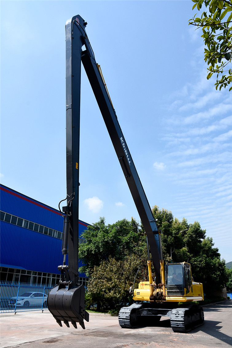 今年会36T两段式加长臂履带式挖机,动臂长12米,斗杆长9米,共计21米,其挖掘高度,挖掘深度,挖掘半径都得到了显著提升,利用这种超长型动臂和超长型斗杆,操作者可在受地面影响的特殊工况下轻松实现挖掘功能,发挥其巨大威力。广泛适用于土砂、混凝土等建筑搬运, 楼体拆解, 地铁出入口开挖,高速公路坡面修整, 河道疏通清淤及建筑基础、深沟等土石方挖掘作业,能完成标准挖掘机不能完成的特殊任务。 而今全国各地纷纷上马地铁建设,河道疏浚治污工程遍地开花,细分市场生机勃勃,占领一席之地,今年会势在必行!